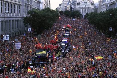 Yesterday there was a huge party all around Madrid, a welcoming party for the team players organised by the government. It was one of the biggest concentrations of people in the entire contemporary history of the country, hundreds of thousands of people partying in the streets, all dressed with red shirts. Spanish flags all over the city, everybody waving the national symbols, feeling (or at least pretending to feel) united.